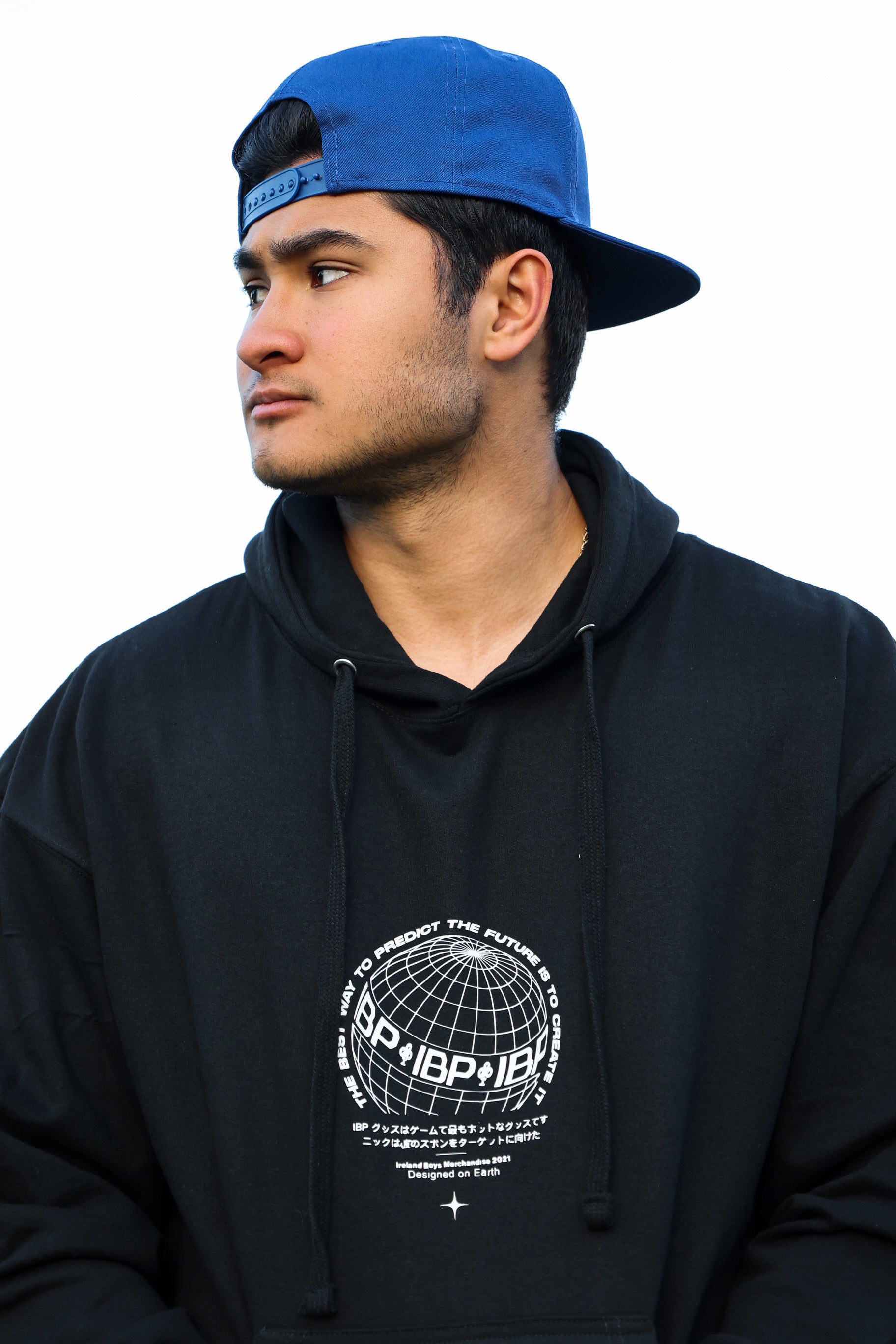 Bright white logos printed on the front and back of the hoodie